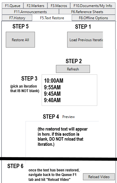3. If the single click of this functions does not restore the text, and VFMZ is telling you to select an iteration, try hitting "Refresh" in the center of the screen. VFMZ may prompt you to select an iteration that you last worked on, the latest versions being closest to the top of the list (center of the screen). They will be listed as times, for example, 3:30, 3:35, 3:40, so on and so forth. Select the latest iteration from the box. You should be getting a text preview in the "Preview" box. If some iterations are blank in the Preview box, this means those versions have been saved blank, and you'll need to find a version that has the text saved. Once you find the version that you want to restore, click to highlight it and press "Restore All."